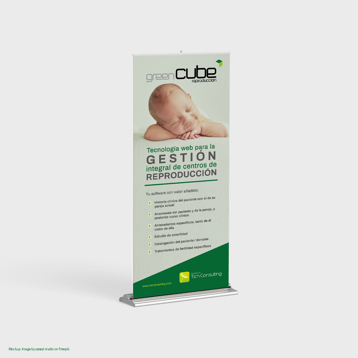 TICH Consulting ha patrocinado el del XVI Congreso ANACER, celebrado en Bilbao. Para ello, desde Comunica preparamos el material promocional para que la nueva herramienta Green Cube Reproducción tuviera impacto promocional en el evento. Queremos compartir contigo el diseño del roll up y flyer, para los cuales creamos una estética específica de marca y mensaje adecuados a la finalidad de este software y su público objetivo.