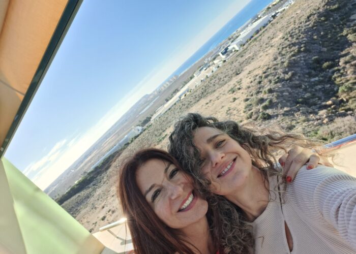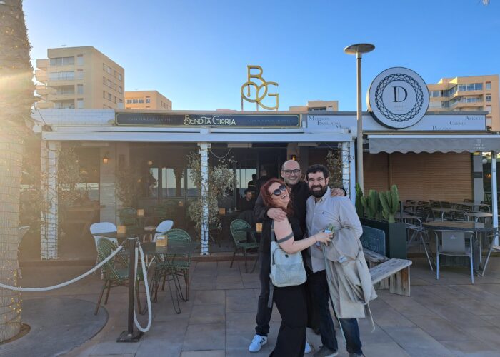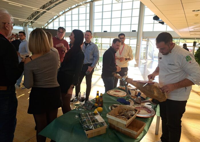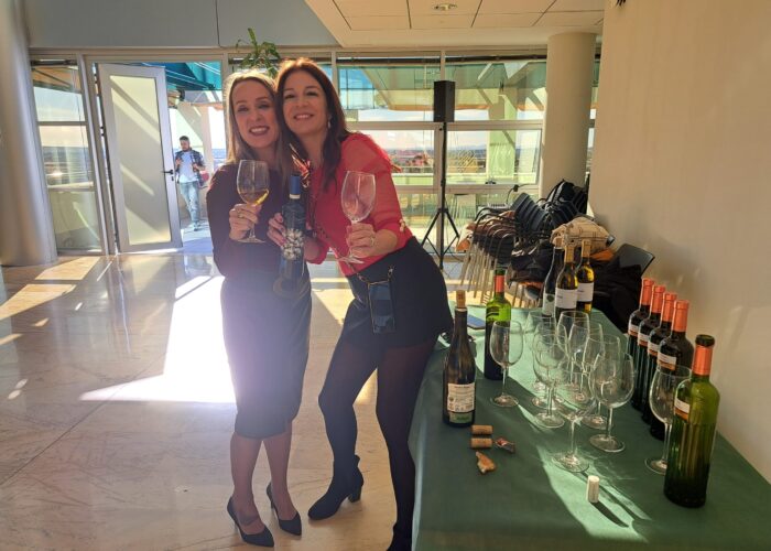 Sobre las 14h, subimos a la sala acristalada para disfrutar no solo de las espectaculares vistas panorámicas y excelente compañía, sino también de jamón al corte, ostras, quesos variados, menús de todo tipo y muchos brindis. Además, de llevarnos a casa una selección de vinos.